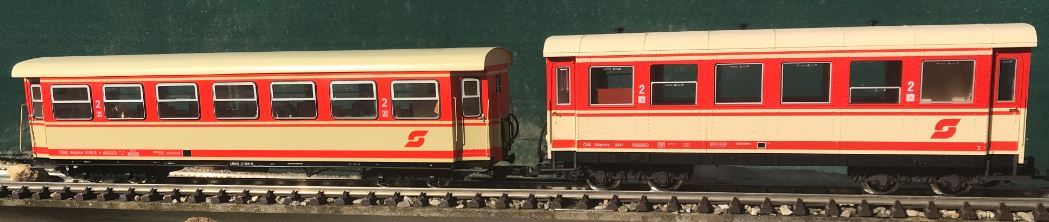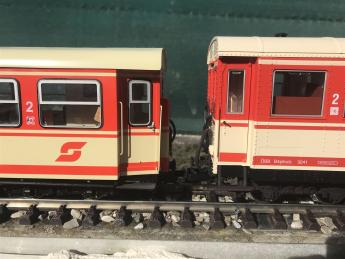 Durch die nicht maßstabsgerechten großen Räder steht der rechte Wagen viel höher und passt überhaupt nicht zu den maßstabsgetreuen Loks der Mariazeller Bahn.