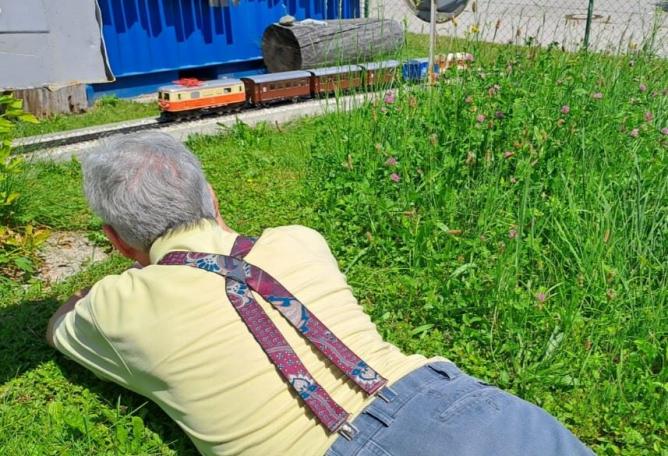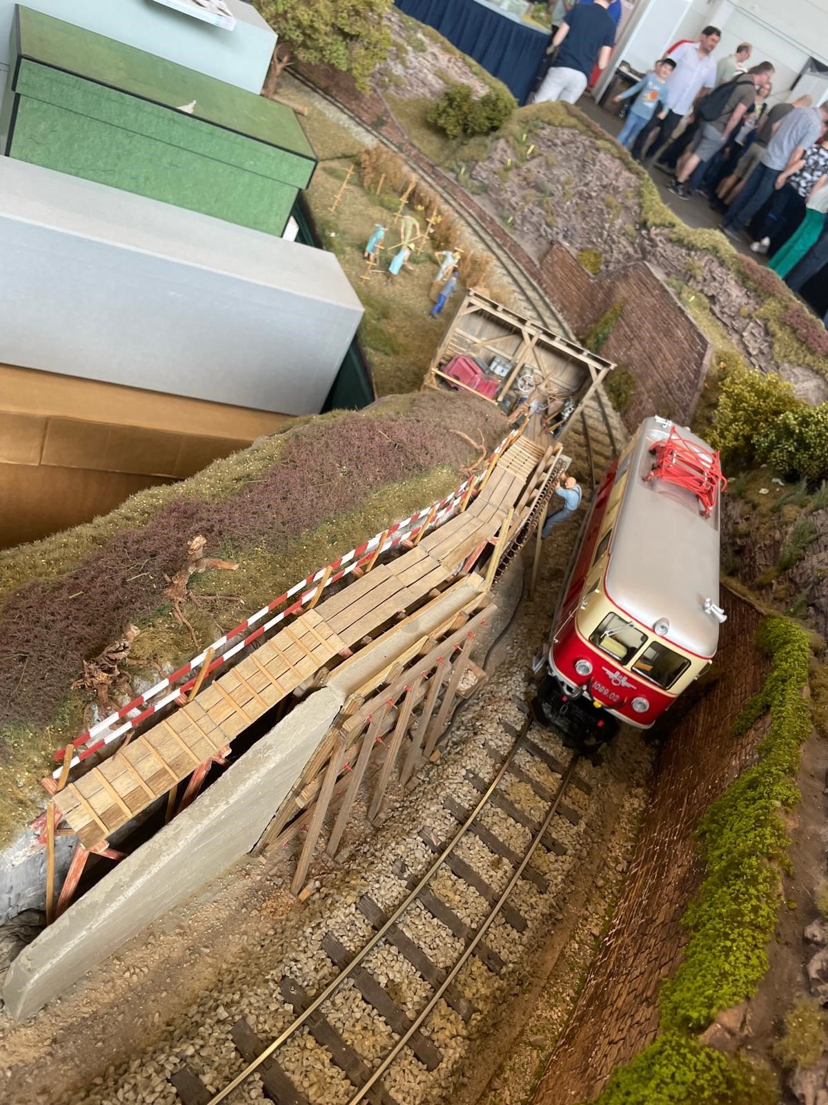 Die für Echtdampf in Burgenland gebaute Anlage, ohne Strom in den Schienen, wird mit 1099 Akku Lok geschoben; per Fernsteuerung.